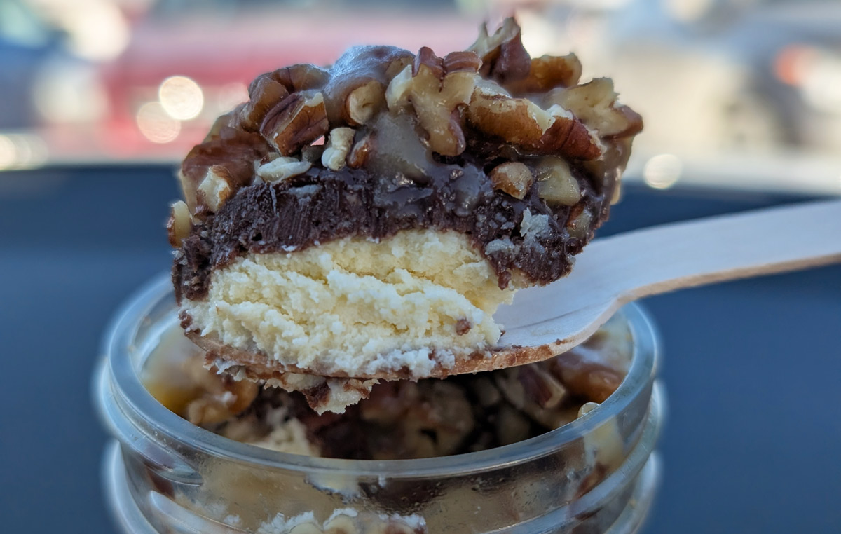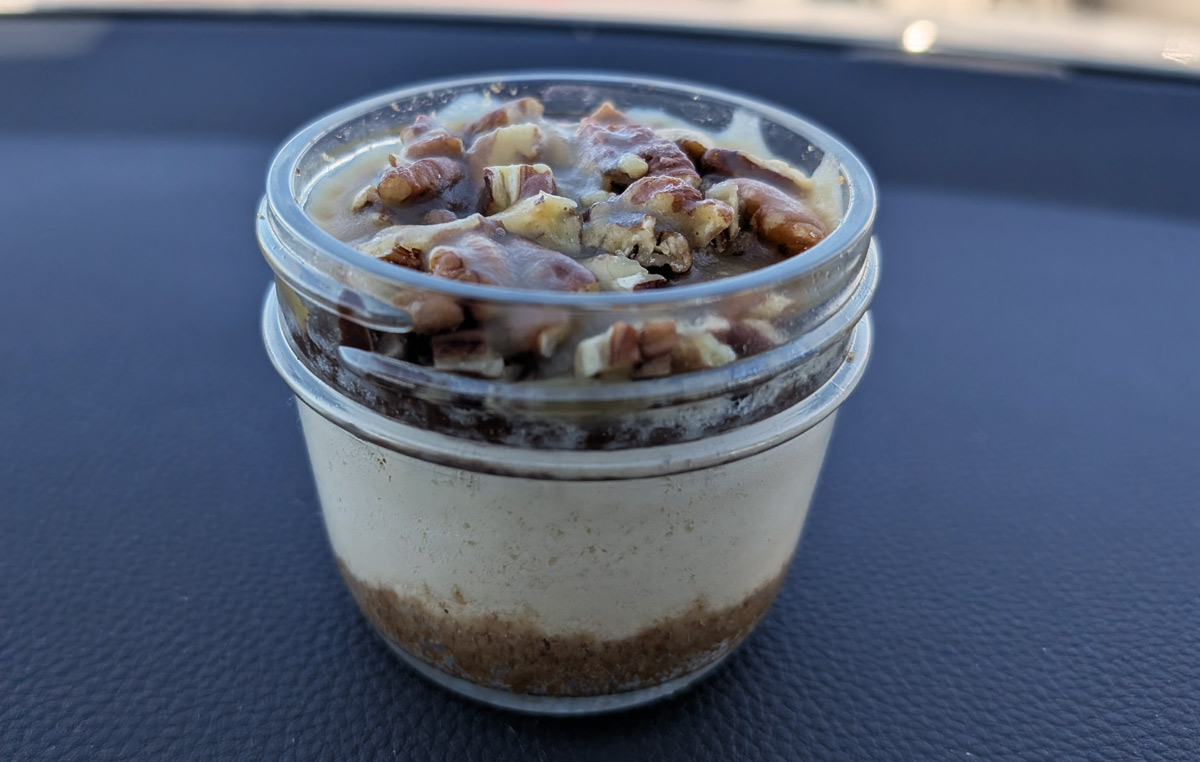 You can get whole cheesecakes, slices, or individual jars of cheesecake, which seems to be their specialty. The jars come in two sizes: four ounce or eight ounce. I found the four ounce serving to be a perfect amount, but eight is there if you really want to cheesecake it up (or if you’re sharing).