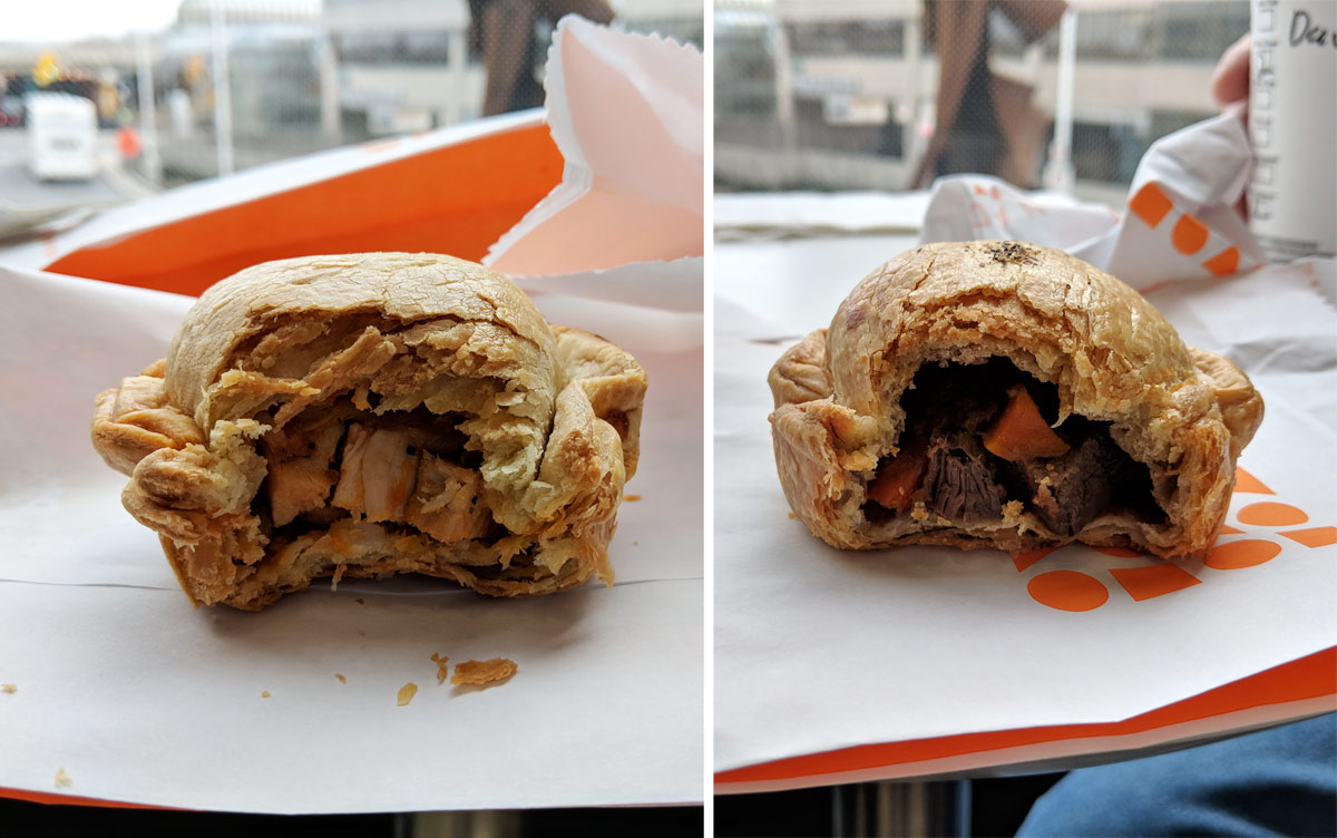 The chicken basquaise had big chunks of chicken interspersed with pieces of peppers (red and yellow peppers, I think? I ate this just a couple of hours ago and it has already almost completely faded from my memory). Like the other pie, it was a bit bland. It was also entirely sauce-less, and the chunks of chicken were kinda dry. But it was fine.