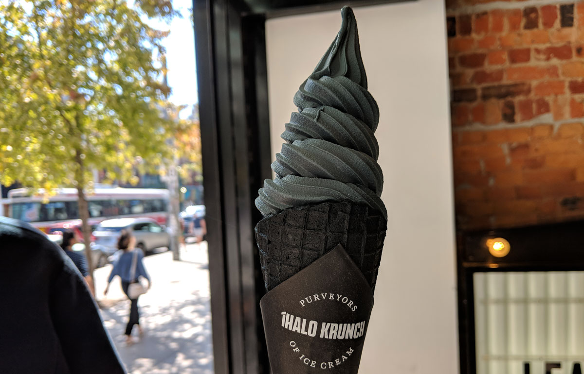 I ordered the black on black, which is coconut flavoured soft serve made jet black thanks to “activated charcoal” (which is basically edible charcoal with some alleged health benefits) served in a charcoal cone.