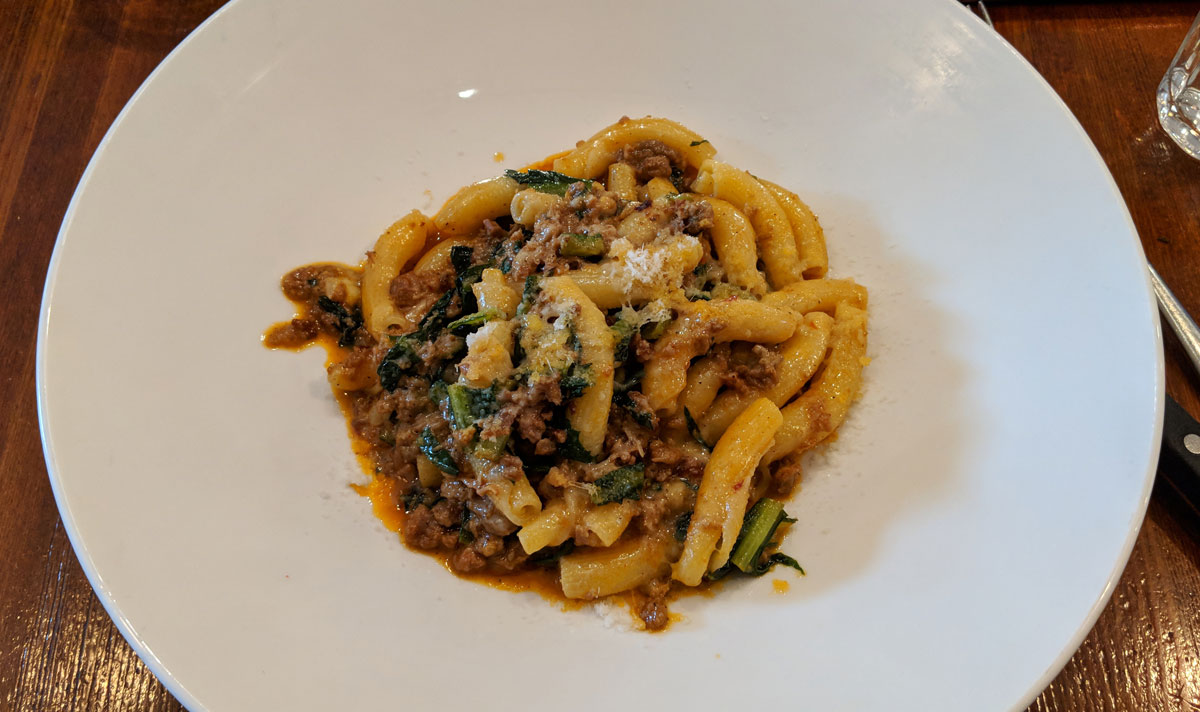 Still, it’s a tasty dish — the sausage is above average and has a mild spicy bite; the cheese adds a good amount of saltiness and a mild funk, not to mention some gooey meltiness; and the pasta itself is perfectly cooked and satisfying. It’s good stuff.