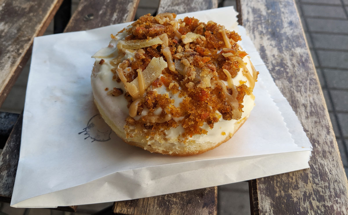 It’s a raised doughnut topped with cream cheese frosting, carrot cake chunks, candied walnuts and ginger, and a caramel drizzle.