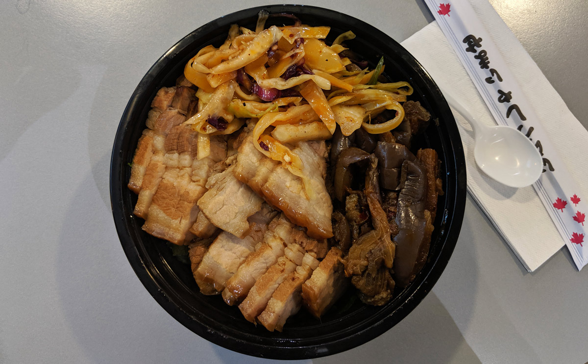 I ordered the braised pork rice bowl, which comes with the aforementioned pork, stewed eggplant (I think?), and a spicy slaw on top of rice.