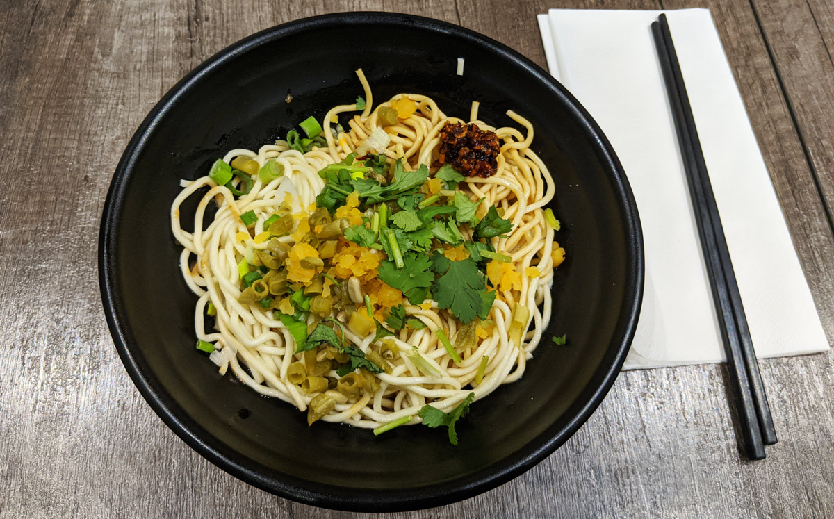 Still, the creamy sesame- and peanut-infused sauce is very tasty; the included spoonful of chili oil gives it a mild kick, and the herbs and pickled veg bring some nice pops of flavour that compliment the creamy sauce.