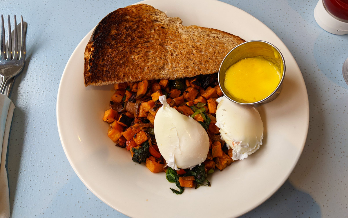 This is the type of thing I’d normally write a full post about (I haven’t even written about Uncle Betty’s on this blog, though I did try the burger for Tasty Burgers), but honestly?  I don’t want to.  I mean, look at it.  It’s basically just a pile of cubed sweet potatoes with some onions and a little bit of spinach interspersed throughout.  No particular seasoning that I could taste, no caramelization or crispiness… just a bunch of bland sweet potato topped with a couple of poached eggs, and served with a slightly congealed cup of hollandaise on the side.  It tasted as sad as it looks.