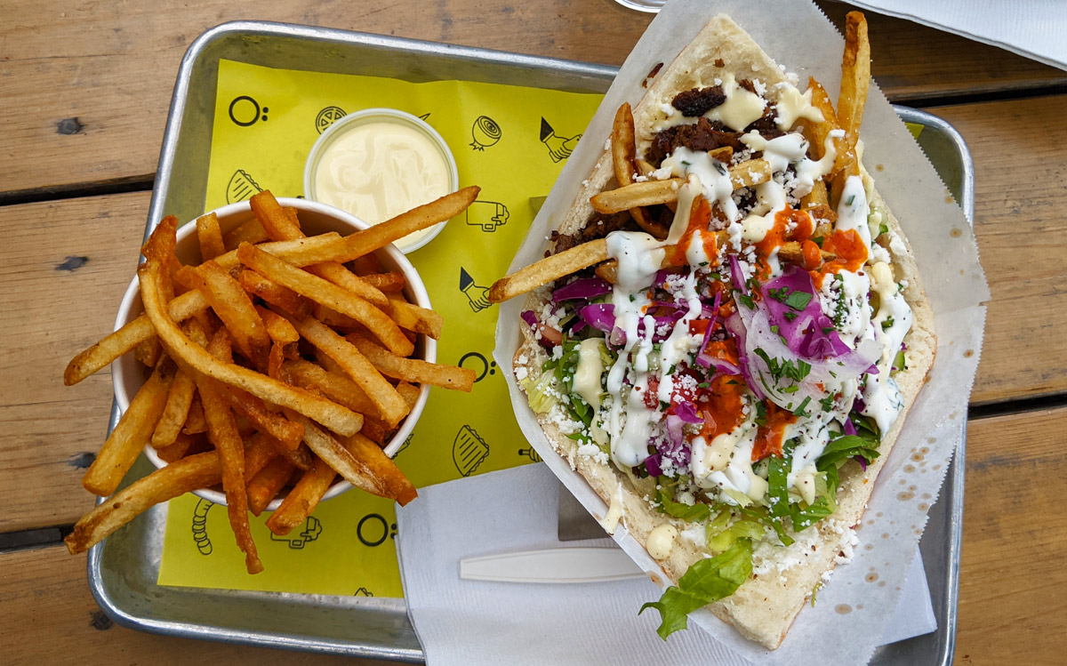 You can choose between garlic, yogurt, and hot sauce — or you can do what I did and get all three, which is definitely what you should do because it’s a very tasty combo (the hot sauce isn’t hot at all, but it’s hard to complain when it’s all this tasty).