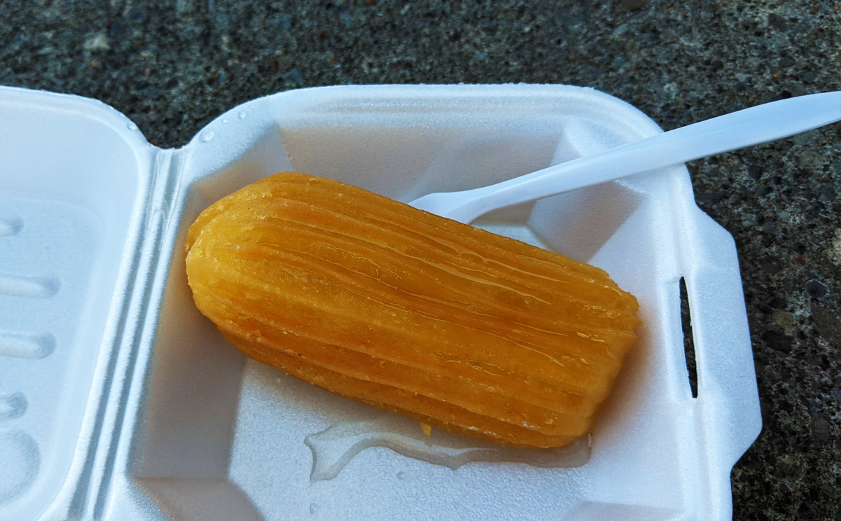 The closest thing I can compare it to is a churro; they’re both fried tube-like pastries with ridges along the outside.