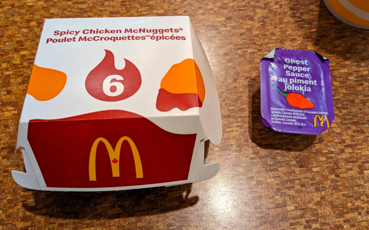 I got the Ghost Pepper dip on the side, and that stuff is actually quite tasty; it’s noticeably hotter than the McNuggets, and it’s creamy and delightfully zippy. The heat sneaks up on you. It doesn’t seem that hot at first, but by the time I was done, my mouth was nice and toasty. I’d buy a whole bottle of that stuff if I could.