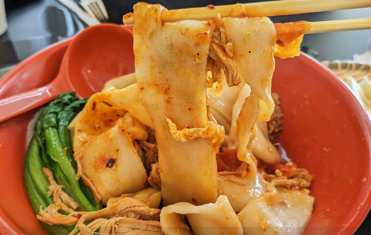 And of course, you can’t go to a place with noodles in the name and not try the noodles, so I went with their specialty, the signature biangbiang noodle.  This is a really unique dish that features a single hand-pulled noodle that’s thicker, broader, and chewier than the norm.  It comes topped with more of that stewed pork, along with a zippy, tomato-y sauce that works really well with the substantial noodles.