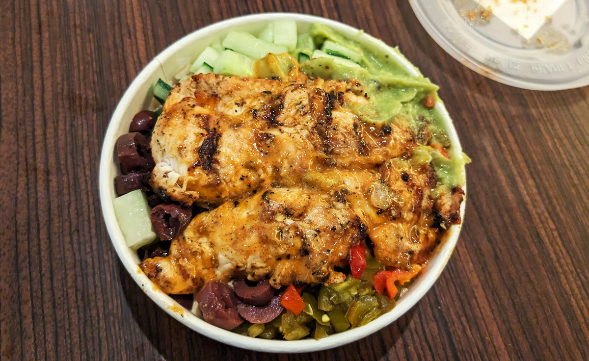 I got the volcano hot chicken on brown rice, and topped it with spicy mayo, olives, cucumber, hot peppers, and a scoop of avocado mash (which costs a bit extra).