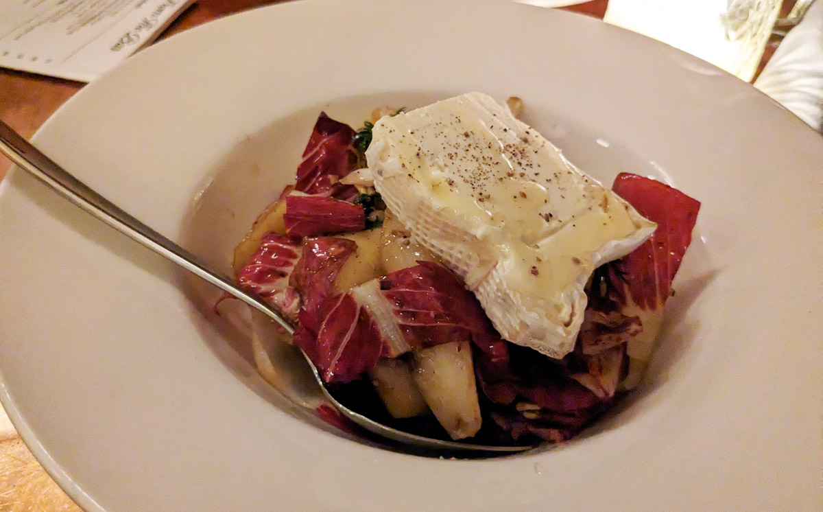I tried a few things. Up first was the warm roast parsnips: “chateau de Bourgogne, pecans, bitter leaves.” This was great; the parsnips were perfectly cooked and had some kind of sweet glaze, and the creamy cheese and crunchy pecans complemented them perfectly.