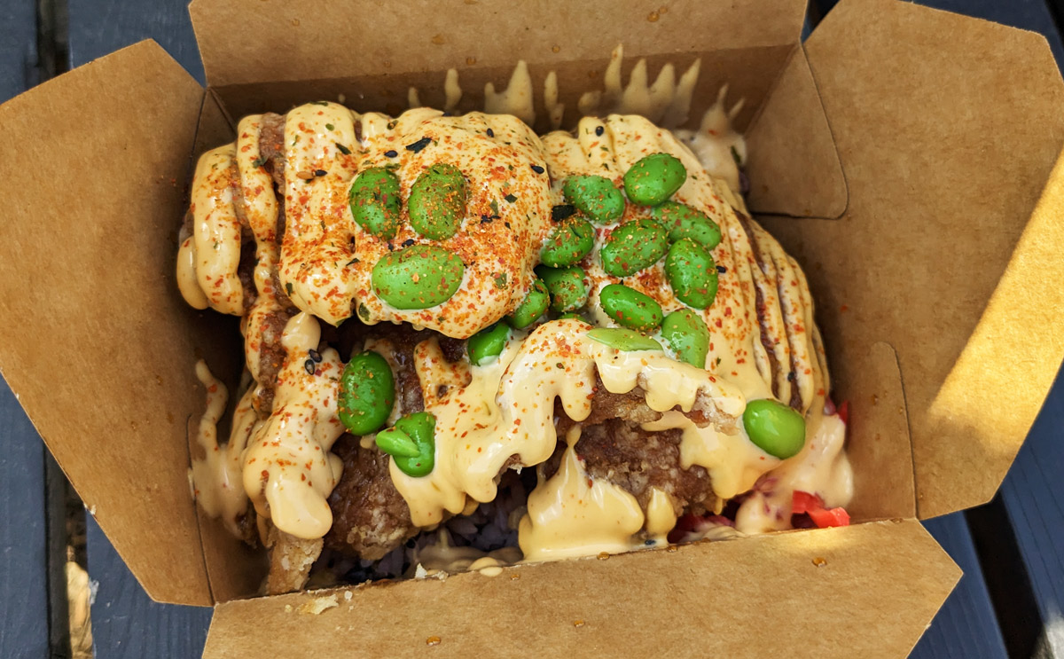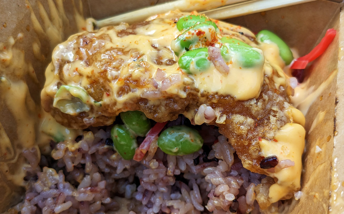 I ordered the original Gushi chicken meal, which comes with a generous amount of karaage (Japanese fried chicken made from bite-sized pieces of thigh meat) on top of purple rice, topped with spicy mayo.