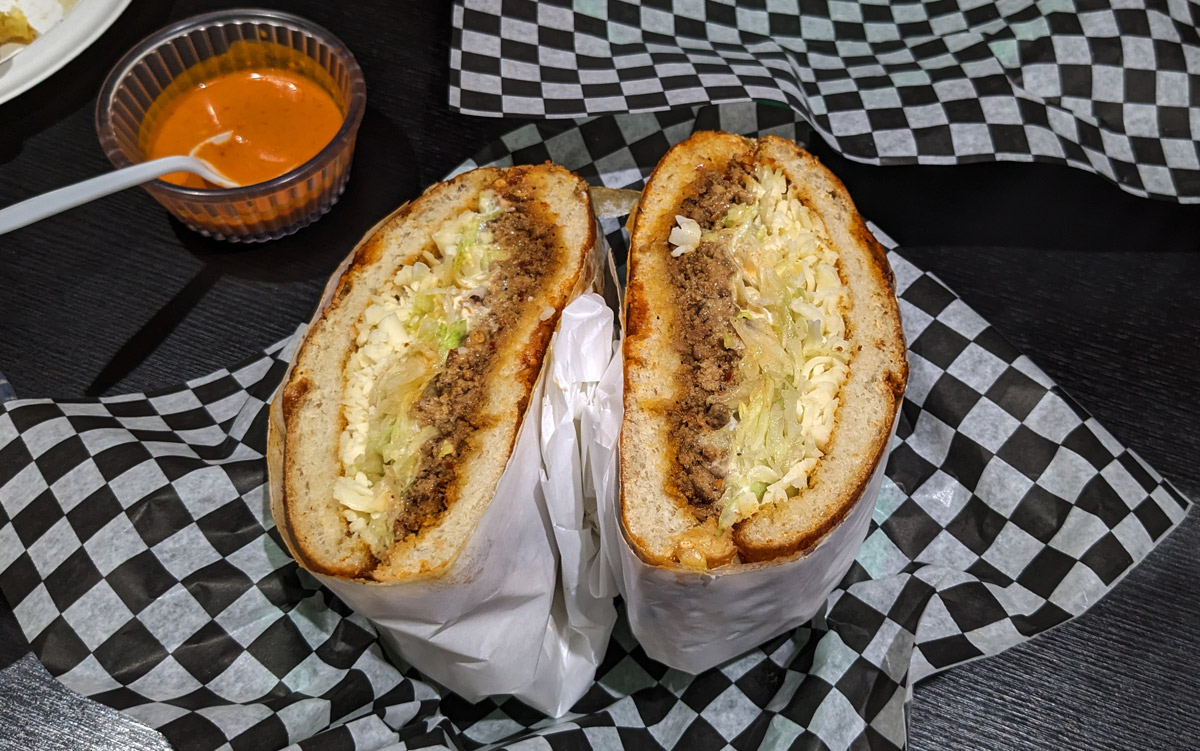 I also tried the pambazo: “bread dipped in guajillo sauce with sausage and potatoes, with sour cream, lettuce and cheese.”