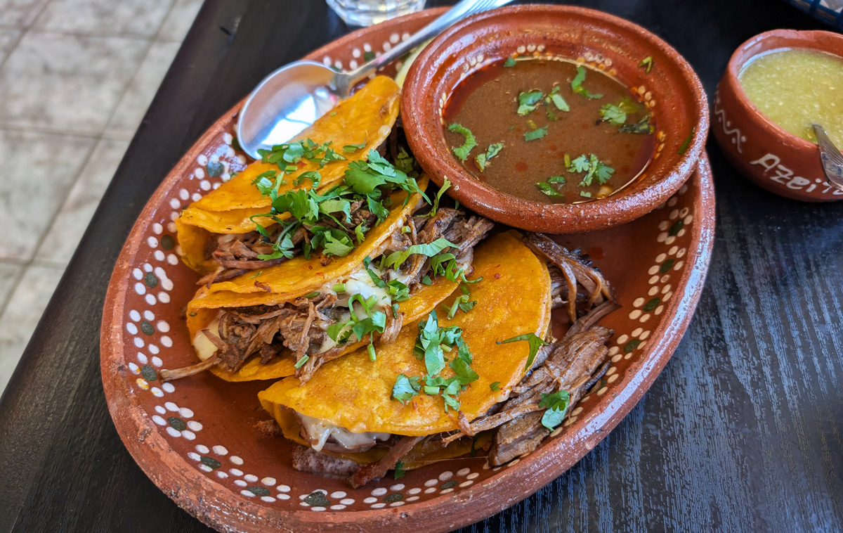 I tried a couple of things. I’d heard the quesabirrias (“stewed beef seasoned on a crunchy corn tortilla with cheese, cilantro, onion and beef broth”) are the thing to order here, so that was a must.