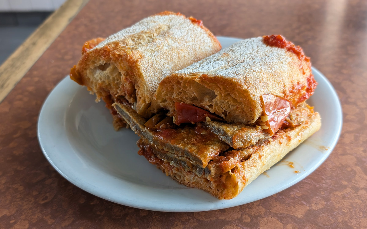 I used to have a pretty hardline opinion that the veal in this type of sandwich needs to be freshly fried and sauced on the spot so that it stays at least a little bit crispy. But I’ve come around to the pleasures of the hot table version of this sandwich, which they serve here, where the sauce has had time to really soak into the nooks and crannies of the veal.
