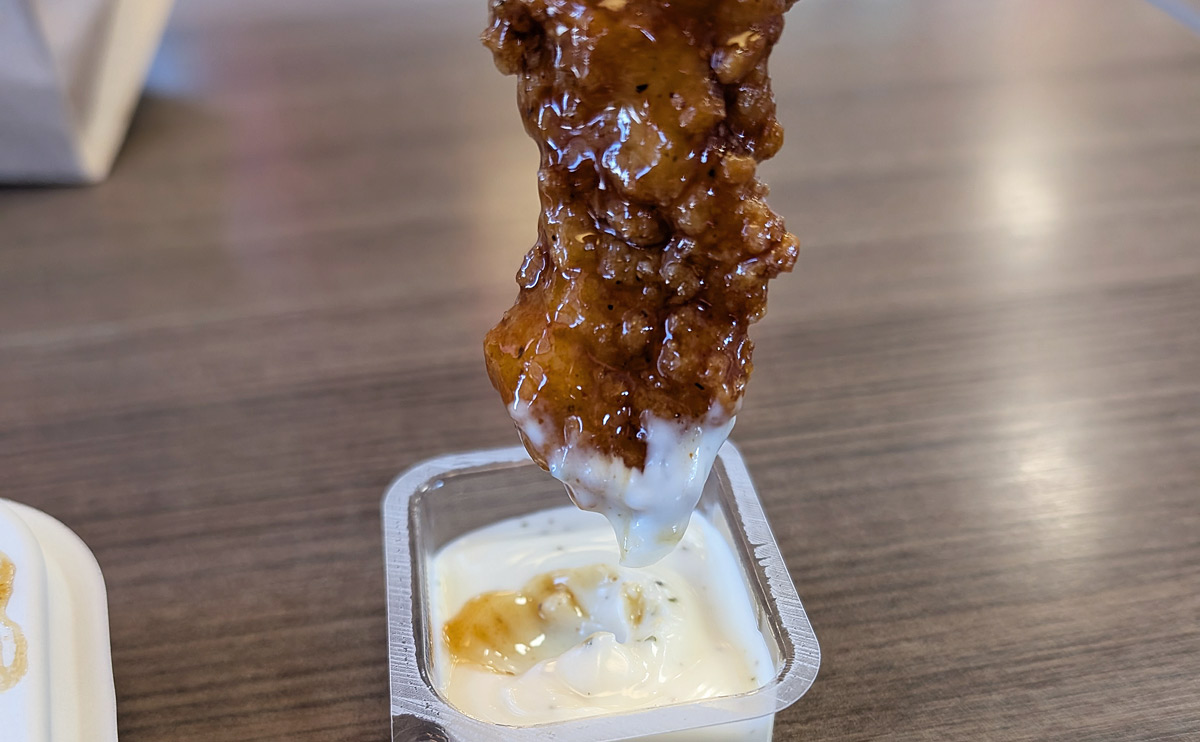 As for the chicken strips themselves, I got lucky with a well-prepared batch — the chicken was nice and fresh and not dry at all. It was sauced to order, which meant that the exterior kept its crunch despite being absolutely doused in the sweet, sticky sauce. Despite my reservations about how sugary these things are, I still quite enjoyed eating them.