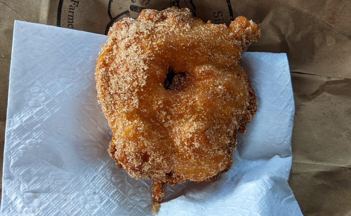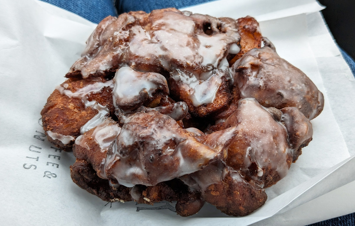 Machino Donuts specializes in vegan doughnuts, and I’ll admit that I’ve dragged my feet on trying it because of that fact. I assumed that the vegan-ness of the place would result in compromised, subpar doughnuts, and I was 100% wrong. I tried three doughnuts here: the apple fritter, the banana bread fritter, and the sour cream orange, and all three were quite tasty. In particular, the apple fritter was right on par with the better fritters I’ve had in the GTA, with a lightly crispy exterior, a nice and tender interior, and a great apple flavour.