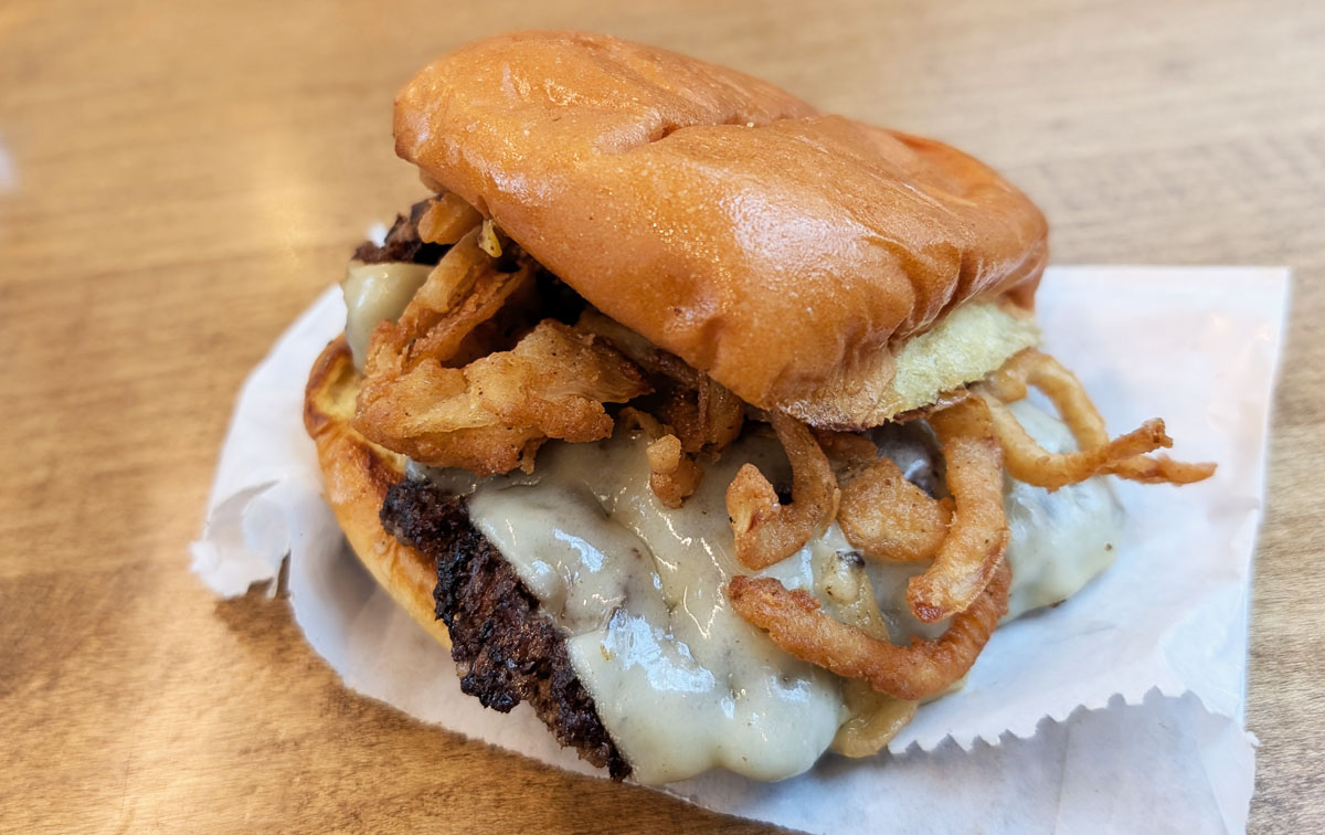 I went with their latest special on this visit, the Black Truffle Burger (“Gruyere cheeseburger topped with black truffle sauce made with real black truffle oil and our crispy sweet onions on a toasted potato bun”), and it was… not thoroughly delicious.