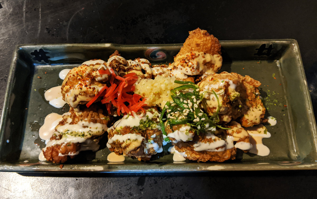 I started, of course, with the karaage, which was a bit of a let-down. It’s well seasoned, with a nice light crispiness on its exterior. But the best versions of karaage are made with juicy dark meat; this was made with dried-out white meat. It certainly wasn’t bad, but the dryness was a bummer.
