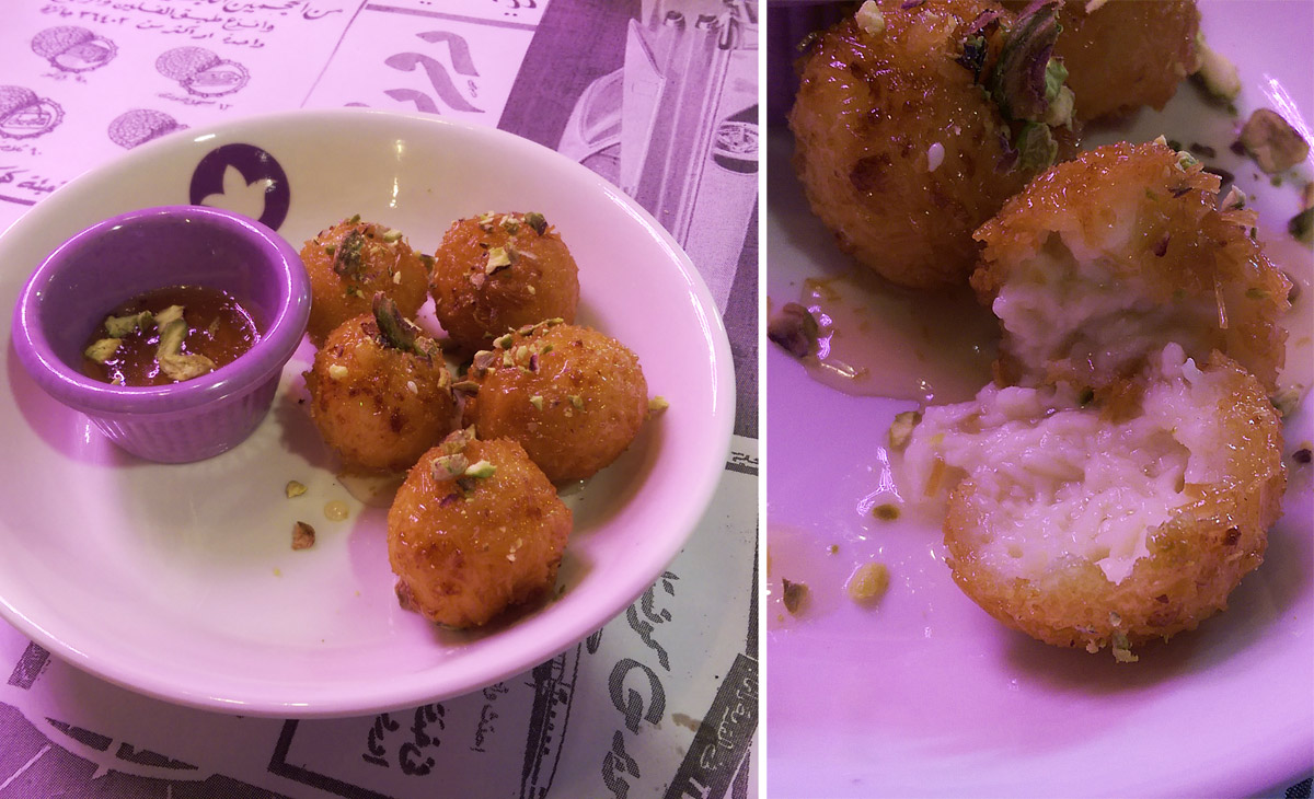 Last up was the kunafah pops, which takes the traditional Middle Eastern dessert and turns it into little deep-fried balls. Like the shawarma, this was the restaurant being a bit too clever for their own good. All of the textures are wrong — the exterior is a bit too crunchy, the cheesy interior doesn’t quite have the gooeyness you’re looking for, and it has a mild oily flavour from the fryer. It certainly wasn’t the worst thing I’ve ever eaten, but traditional kunafah would have been vastly superior.