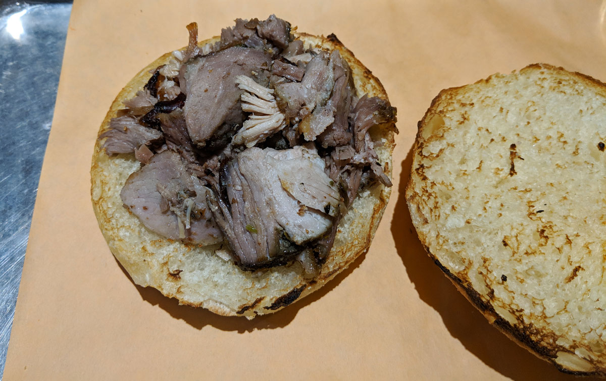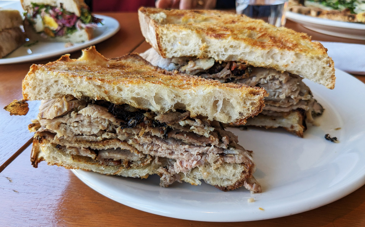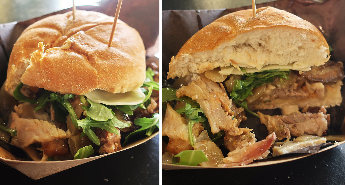 First up is the porchetta, which is as simple as it gets — it’s just a whole bunch of sliced porchetta on toasted sourdough. If the porchetta itself weren’t so good, this might have been too simple, but the tender, herby, and intensely flavourful pork shines brightly enough to not need any accompaniments.