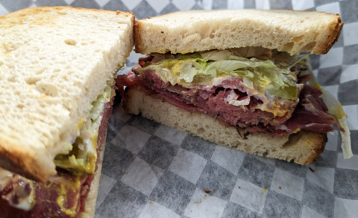 But hey, I’m here, so… sure, why not? I went with the pastrami on rye (“Thin-sliced pastrami, pommery aioli, pickles, sauerkraut, rye”) which the woman behind the counter popped into an oven of some sort to heat up.