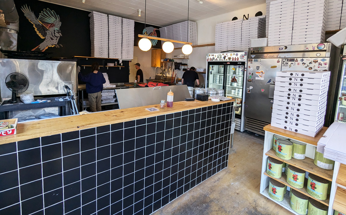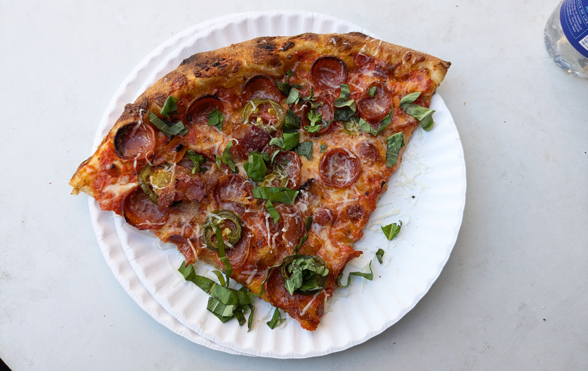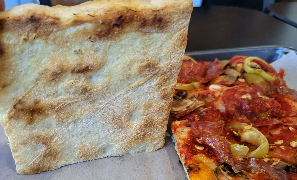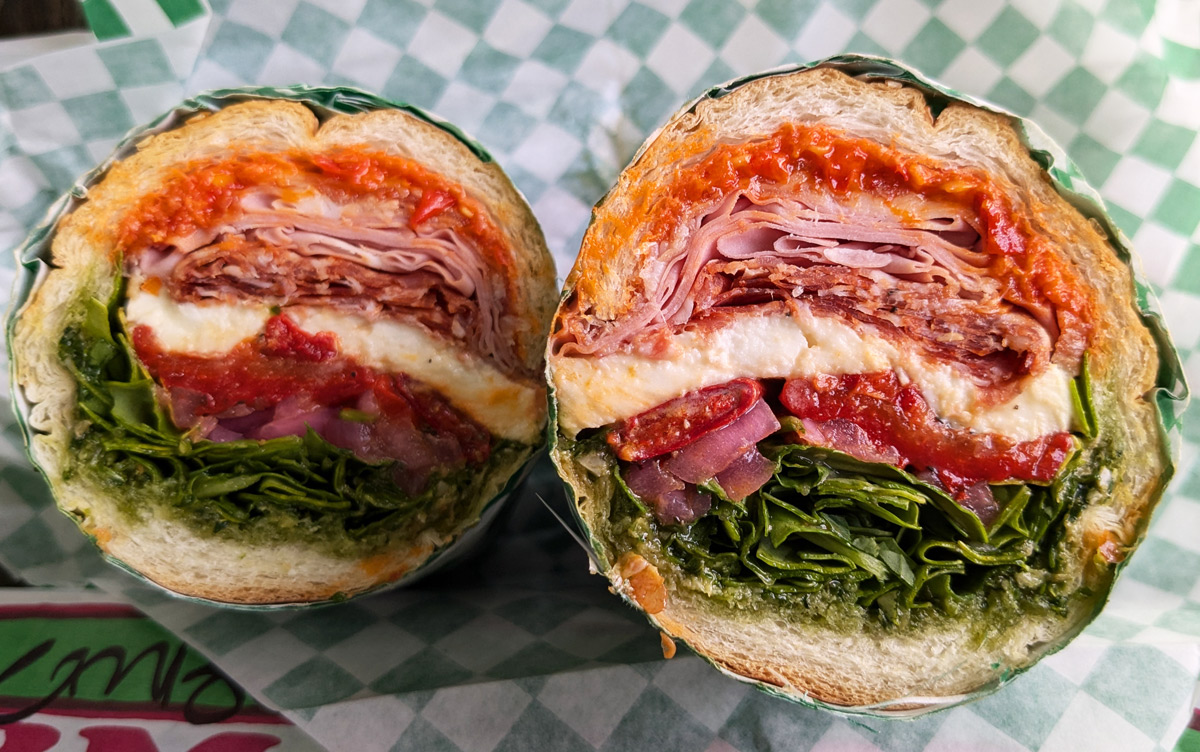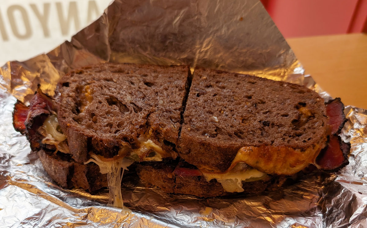 But hey, I’m here, so… sure, why not? I went with the pastrami on rye (“Thin-sliced pastrami, pommery aioli, pickles, sauerkraut, rye”) which the woman behind the counter popped into an oven of some sort to heat up.