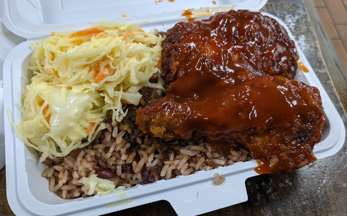 I was hoping to order the jerk chicken, but they were out of dark meat, so I went with the BBQ chicken instead. You have your choice of sides; I got rice and peas (which they top with oxtail gravy), and coleslaw.