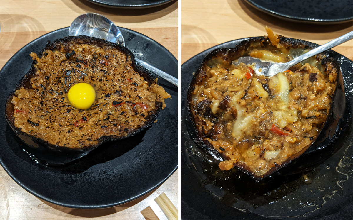 The waitress explained that you should mix this one up so that the egg combines with the eggplant and the pork. The eggplant is soft, but still has some texture, and works very well with the meaty ground pork. The miso gives it an addictively savoury flavour, and the egg cranks up its silky richness. It’s a tasty dish.