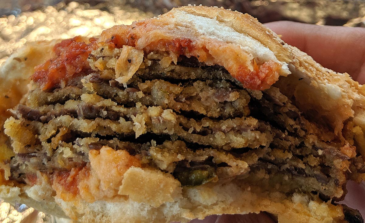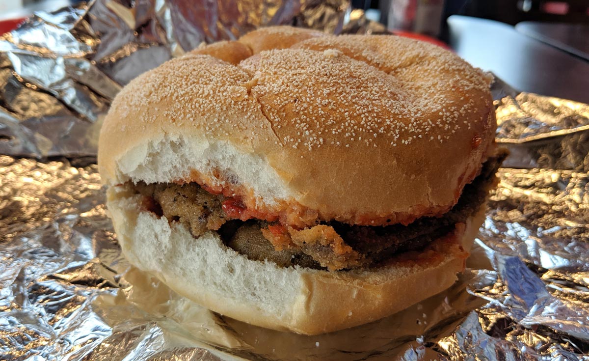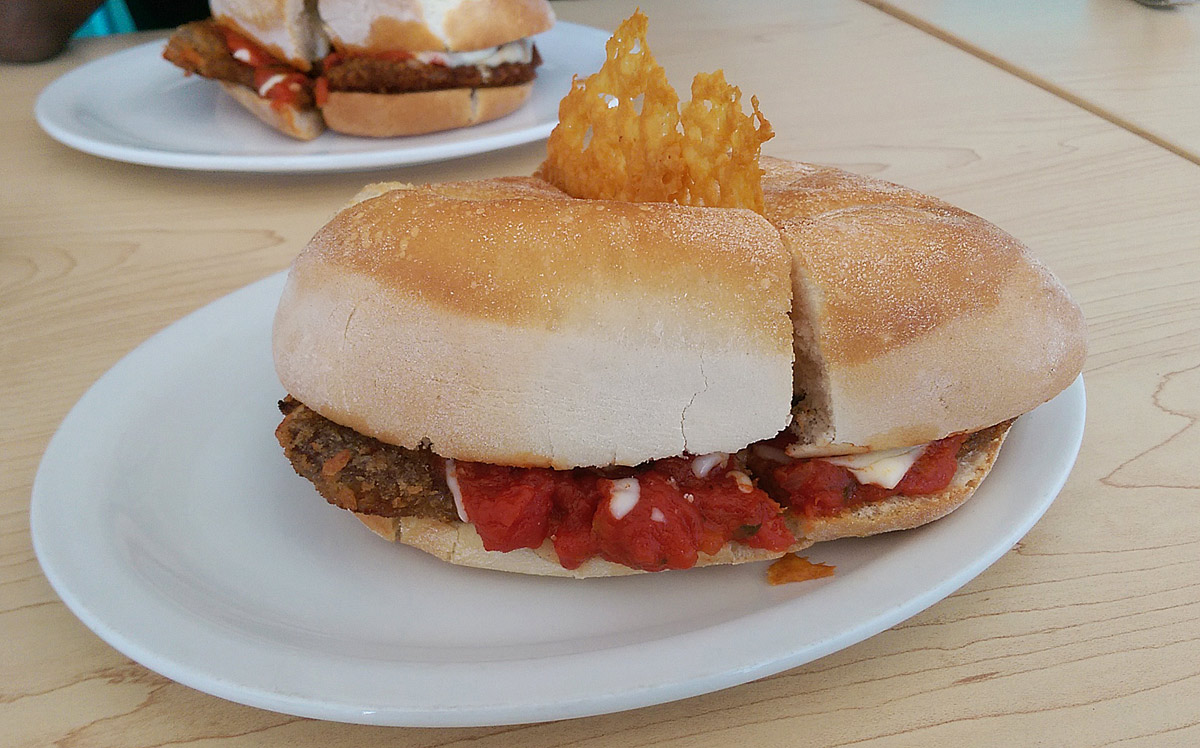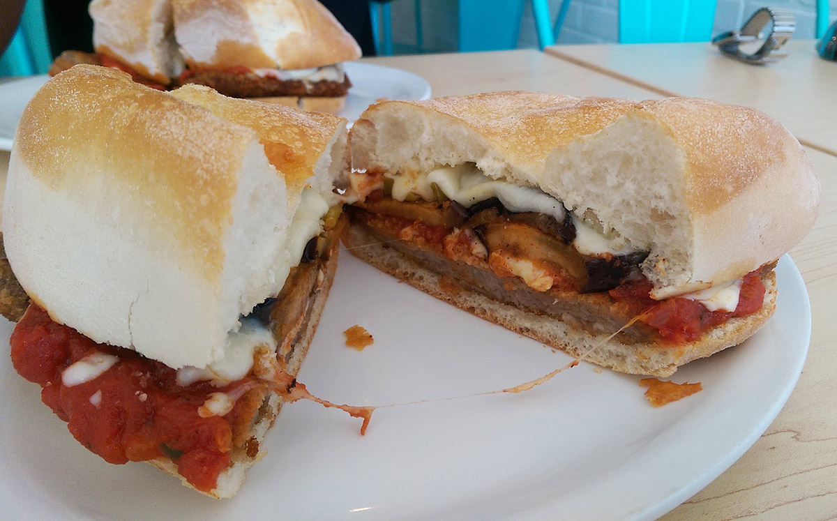The sandwich consists of “Grilled Eggplant, melted Bocconcini in a fresh tomato based basil sauce with melted Provolone and crispy Parmesan on a soft bun.”