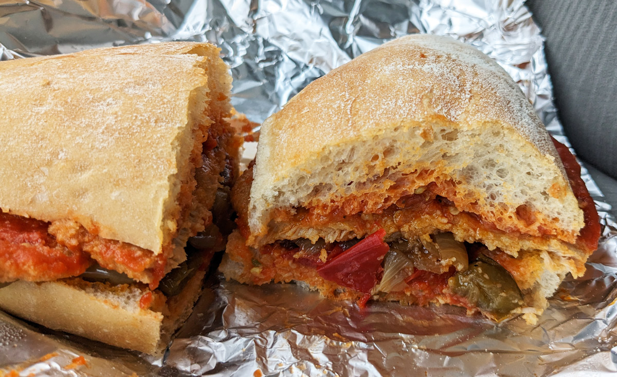 It’s a simple enough sandwich: a fried veal cutlet, a couple of slices of fried eggplant, sauteed onions, peppers, and mushrooms, a generous ladle of tomato sauce, and some hot peppers if you feel like kicking it up a few notches.  It’s all served on a crusty roll that does a great job of holding up to the very messy sandwich without falling apart.