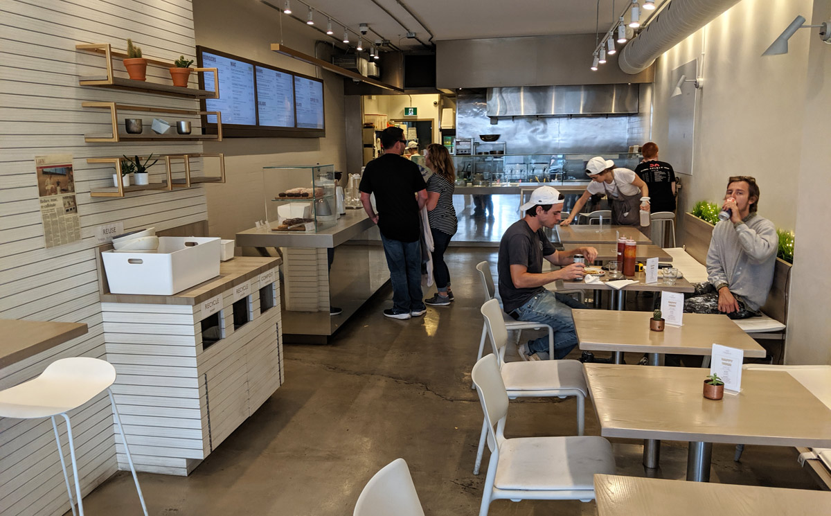 But the broccoli was nicely roasted and liberally dressed with a zippy, garlicky Caesar dressing, and yeah, it worked. The “chick’n” tenders were crispy and warm from the fryer, and the fake chicken inside was close enough to the real deal that, with all the veggies and dressing, it was quite passable.